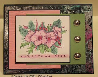 The Technique Junkie Blogstravaganza continues! Today's card uses the sketch from the Technostamper Sketch Challenge (TSSC#43). this was an easy sketch, and I really enjoyed making this card! I dug deep into my magic drawer of unused backgrounds until I found this gorgeous piece of Cling and Scrunch (from the June 2007 issue of the Technique Junkie Newsletter). The image was colored with the Gamsol Pearls Technique (June 2006 issue). Stamps: Stampin' Up!